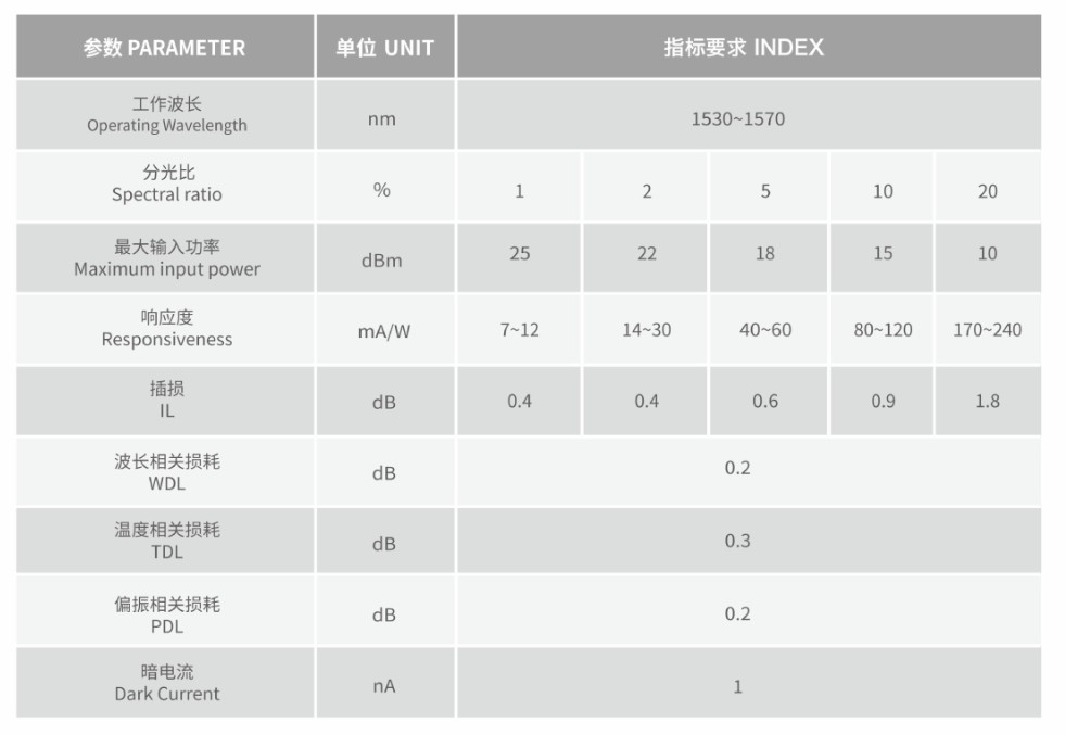 雙芯尾纖式結(jié)構(gòu),實現(xiàn)一定比例的光透射到探測器,其余的光反射到另一根光纖。用于WDM網(wǎng)絡(luò)監(jiān)控、光纖放大器、光開關(guān)等。