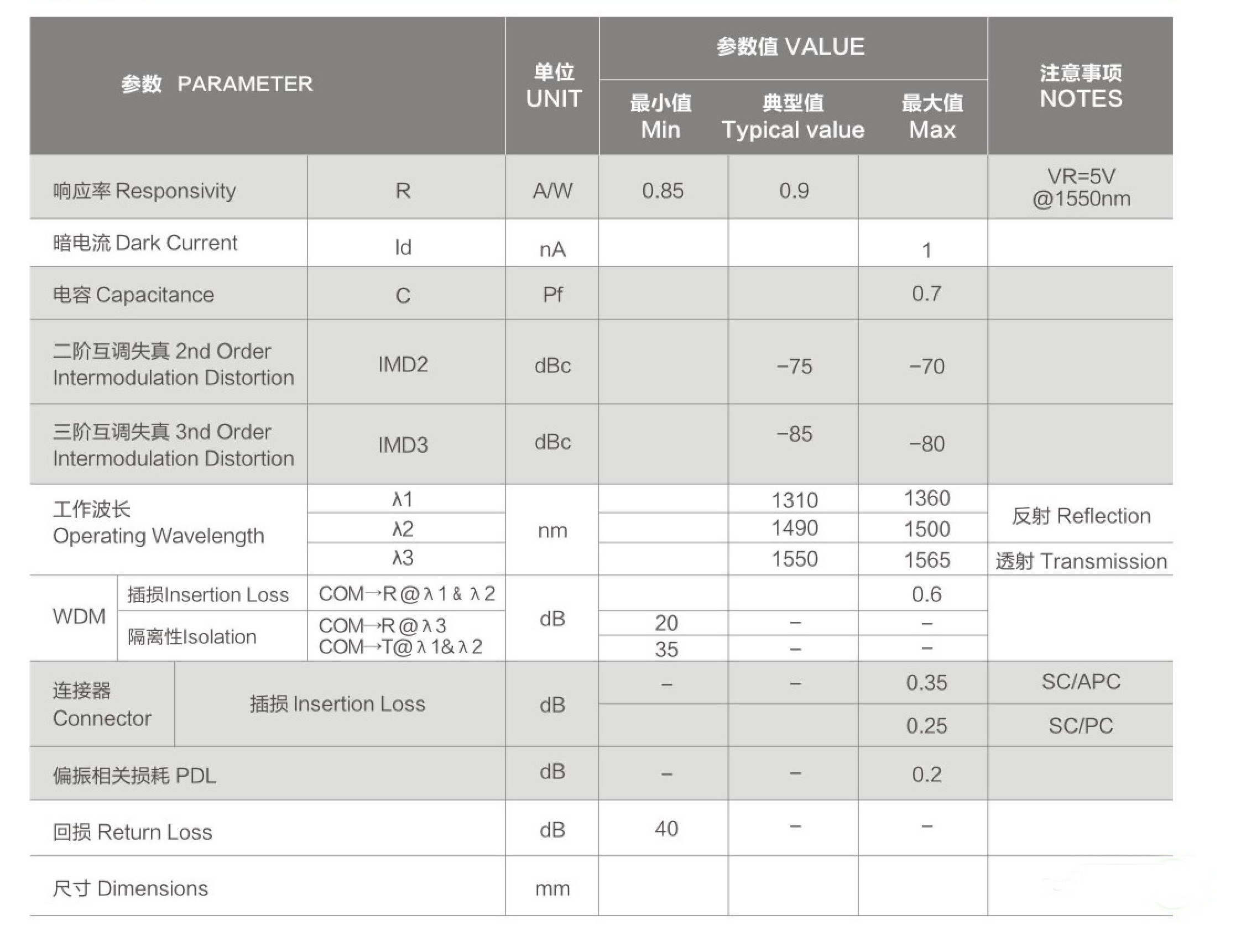 雙芯尾纖式結(jié)構(gòu),實現(xiàn)1550nm模擬接收,1310nm和1490nm反射進入另一根光纖。